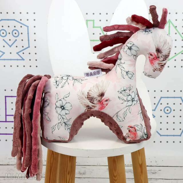 handmade koń ptaki w kwiatach róż - przytulanka sensoryczna maskotki