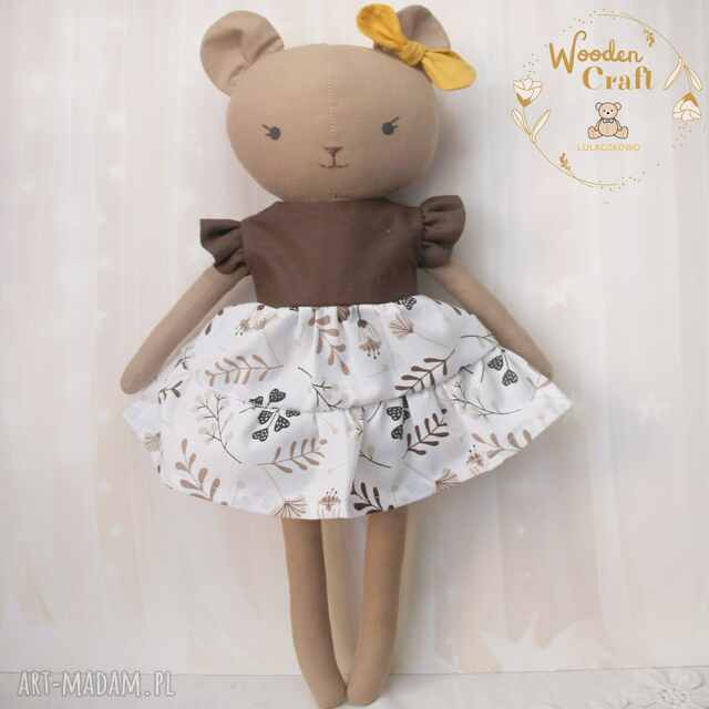 Przeurocza przytulanka, miś, a właściwie misia w kolorze ciemnego beżu, uszyta ręcznie z najwyższą starannością, ubrana w uroczą sukieneczkę z falbankami w kolorze brązu z motywem kwiatowym, z musztardową kokardką na uszku. Wykonana ze 100% bawełny, wypełniona antyalergiczną kulką silikonową. Oczka malowane wodoodpornym markerem, nosek i buźka wyszyte muliną. Górne i dolne łapki układają się luźno, misiunia siedzi z podparciem. Sukieneczkę można swobodnie zdejmować, jest zapinana na rzep.