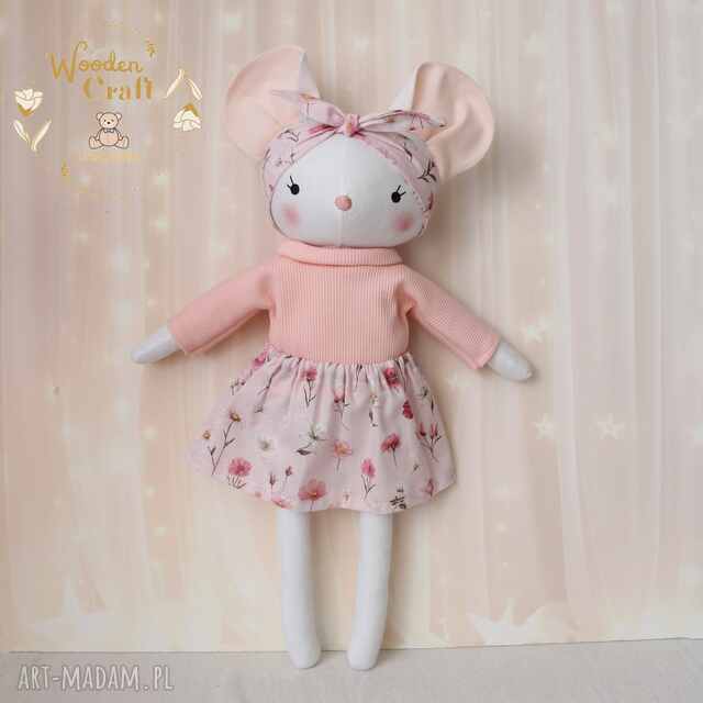 Przeurocza przytulanka, biała myszka, uszyta ręcznie z najwyższą starannością, ubrana w różowy sweterek w prążki, i różową, kwiatową spódniczkę oraz opaskę. Wykonana ze 100% bawełny, wypełniona antyalergiczną kulką silikonową. Oczka malowane wodoodpornym markerem, nosek wyszyty muliną. Spódniczkę i sweterek można swobodnie zdejmować, posiadają gumeczki. Górne i dolne łapki układają się luźno, myszka siedzi z podparciem.