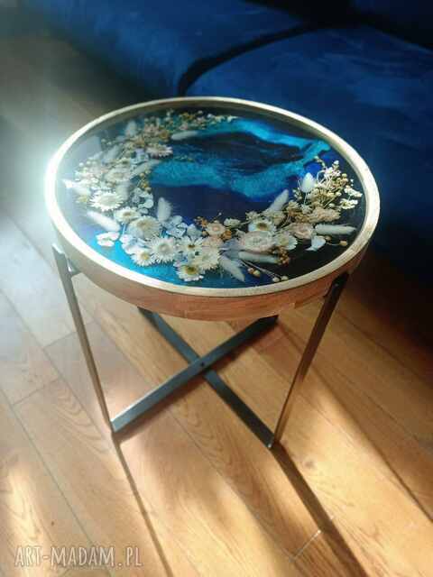 Kompozycja stolika tworzona jest indywidualnie po akceptacji zamówienia - masz wpływ na odcień niebieskiego tła, dobór kwiatów (kocanki, len, lagurus) oraz ich ułożenie. Czas realizacji wynosi około 2 tygodni - to czas potrzebny na staranne wykonanie kompozycji i prawidłowe utwardzenie warstw żywicy.