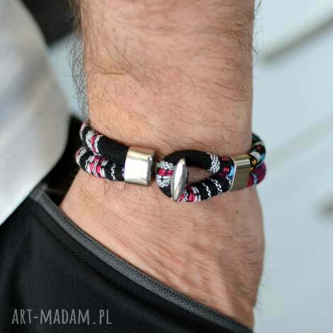 Bransoletka męska boho aztekoo duo satin steel. Wygodna bransoletka wykonana z okrągłego, szytego rzemienia z materiału bawełnianego o wyraźnym splocie (o śr, 6mm), 18cm, UWAGA55,00 zł