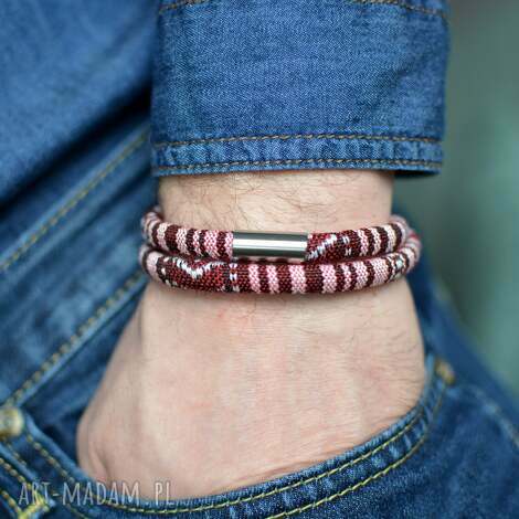 Bransoletka męska boho etnum z hakiem ze stali szlachetnej. Męska bransoletka w stylu boho wykonana z szytego, okrągłego rzemienia, liny (śr, 6mm) z tkaniny o wyraźnym splocie, 17,576,00 zł