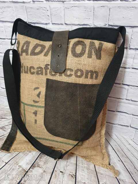 Torba z worka po kawie i skóry - unikat. Jedyny egzemplarz, Unikatowa torba stworzona z worka po kawie oraz postarzanej skóry, juta, Uniseks150,00 zł
