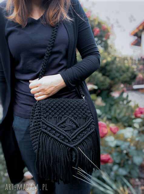 Wyjątkowa torebka worek ręcznie wypleciona metodą macramy w kolorze czerni.