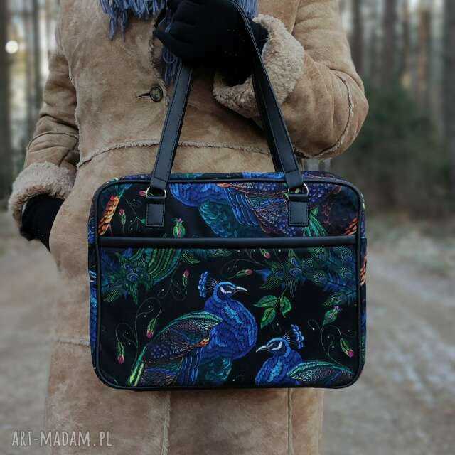 Torebka wykonana z wysokiej jakości tkaniny w pawie (przyjemny w dotyku welur) oraz lamówki, rączki i długi pasek czarna skóra ekologiczna. Wnętrze wykończone podszewką bawełnianą.