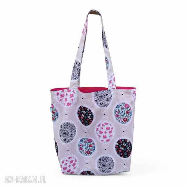 Ekologiczna torba na zakupy uszyta z bawełny 100% z nadrukowanym kolorowym wzorem i różową podszewką.