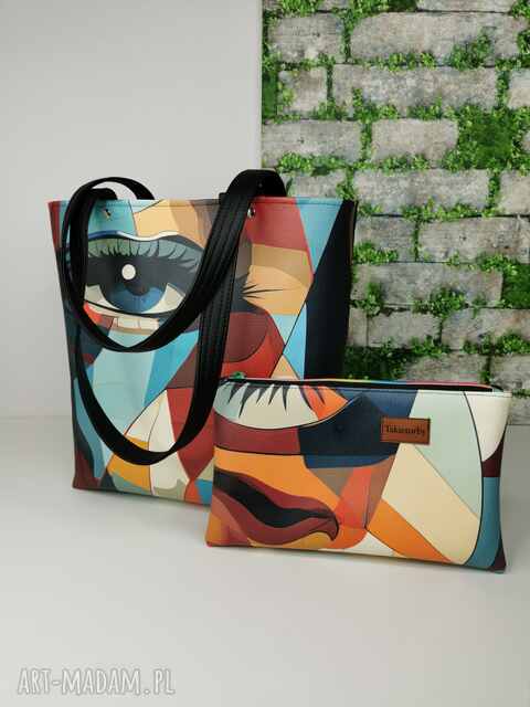 Torebka damska shopper bag z kosmetyczką torebka na ramię zamykana ekoskóra - oczy