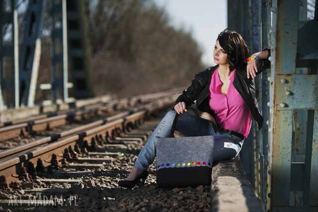 Torebka została wykonana z grubego, mocnego filcu. Prosta forma, ciekawie zdobiona kolorowymi kropeczkami i solidnie wykonana. Bardzo urocza! Długość torebki - około 41 cm, wysokość około 37 cm. Została wykonana z dbałością o każdy szczegół - zapięcie na suwak, w środku 2 kieszonki- na telefon i inne drobiazgi. Z tyłu torebki znajduje się bardzo duża kieszonka na suwak. Torebka jest bardzo pojemna - spokojnie mieści format A4. Rączki torebki zostały dodatkowo wzmocnione taśmą - są bardzo mocne. Długość rączek - około 54cm. Gorąco polecam!