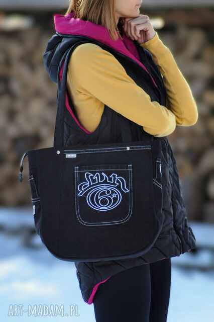 Torebka na ramię, uszyta z kawałków czarnych spodni jeansowych oraz z czarnej tkaniny tapicerskiej imitującej len.
