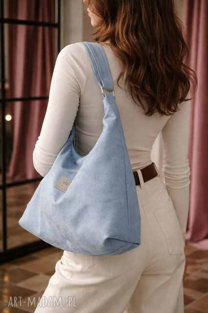 handmade zamszowa torba hobo w kolorze błękitnym na ramię