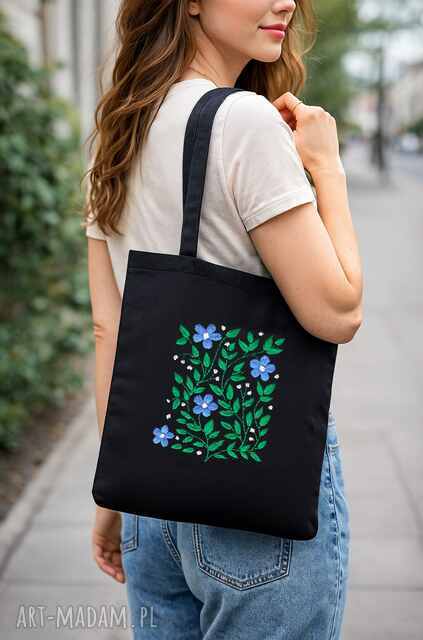 🌼 Ta wyjątkowa torba została wykonana z czarnej bawełny i ozdobiona pięknym, ręcznie haftowanym wzorem w odcieniach zieleni i błękitu. Delikatne, misternie wyszywane kwiaty tworzą naturalną kompozycję, która przyciąga wzrok i nadaje torbie niepowtarzalny charakter.