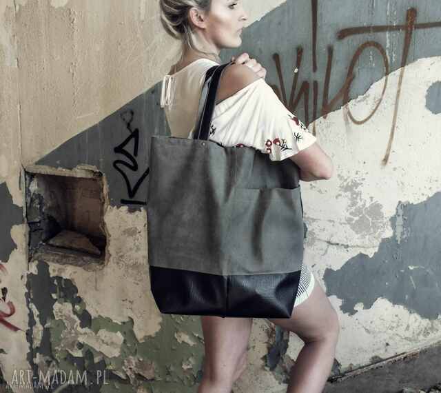 Duża torba na ramię w kolorze stalowym, uszyta z eko zamszu. Dolna część wykończona eko skórą. W bocznym panelu spora podręczna kieszeń. Torba świetnie sprawdzi się podczas zakupów, do szkoły i do pracy. Bardzo pojemna. Minimalistyczny design i neutralny kolor sprawia, że pasuje do każdej codziennej stylizacji. Dno torby wykończone wkładem usztywniającym, który można wyciągać.
