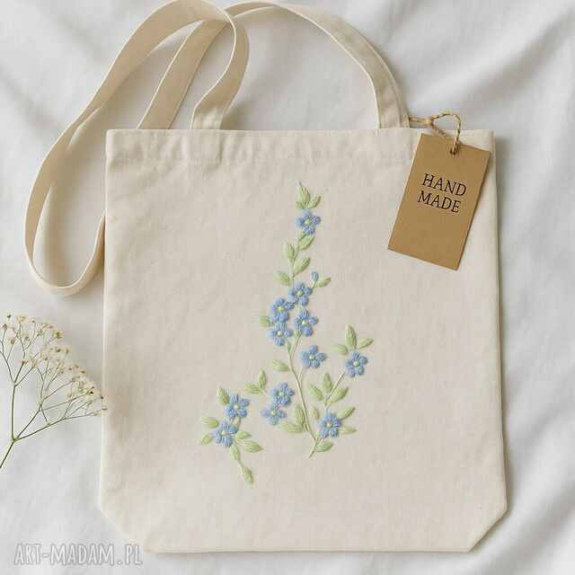 Subtelny haft niezapominajek - drobnych, niebieskich kwiatków z żółtymi środkami i zielonymi listkami - dodaje tej torbie uroku i lekkości. Kwiaty symbolizują pamięć, wierność i delikatność - to piękny, naturalny motyw, który niesie ze sobą pozytywne emocje.