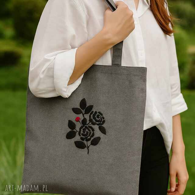 Na pierwszym planie tej torby znajduje się subtelny haft róży - eleganckiej, czarnej, z małym czerwonym serduszkiem w centrum. Ten drobny detal niesie za sobą symbolikę miłości, delikatności i siły - zamkniętą w minimalistycznej formie. Każdy haft wykonany jest ręcznie, z najwyższą dbałością o detale, dzięki czemu każda torba jest wyjątkowa - niepowtarzalna jak Ty.