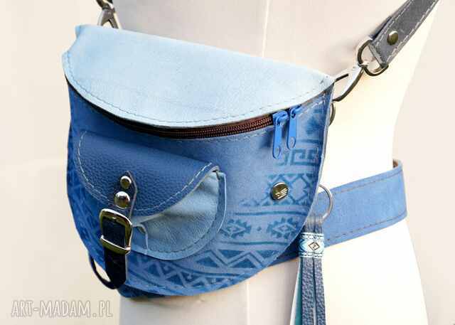 Praktyczna torebka na pas uszyta ze skór naturalnych (licowe i zamszowe). Odcienie niebieskiego i błękitu. Zdobiona malowanym ręcznie motywem etnicznych wzorów. Niewielka ale pojemna, pomieści telefon, portfel, chusteczki i najpotrzebniejsze kosmetyki. Z tyłu kieszeń otwarta, a z przodu kieszeń zapinana na magnes. Wewnątrz przegródka. Pasek regulowany, zapinany na karabińczyki. Można ją nosić również na ramieniu. Wymiary: 21/17cm.