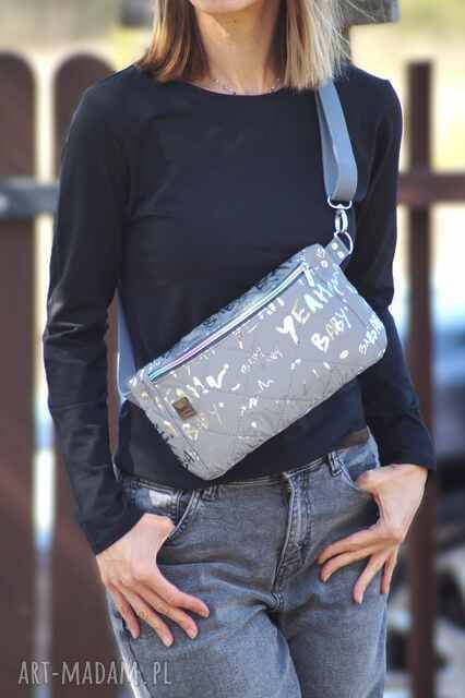 Kompaktowa, płaska saszetka do noszenia na ukos, uszyta z odblaskowej wodoodpornej tkaniny w kolorze szarym ze srebrnymi napisami. Tkanina po zmroku odbija światło na całej swojej powierzchni.