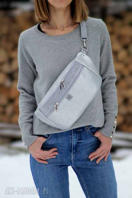 Pojemna nerka do noszenia na ukos z odpinanym paskiem, uszyta z pikowanej w serca metalizowanej jasnoszarej skóry ekologicznej oraz z szarej melanżowej tkaniny tapicerskiej imitującej len.