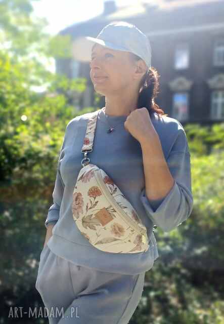 Nerka torebka damska z wodoodpornej tkaniny imitującej len z motywem jesiennych kwiatów.