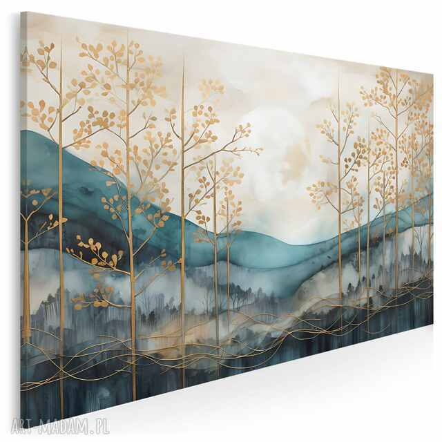 DESIGN: Elegancki, nastrojowy obraz inspirowany naturą i pejzażem w nowoczesnym wydaniu. Subtelne połączenie złota, turkusu i szarości tworzy harmonijną dekorację pasującą do wnętrz klasycznych i nowoczesnych.