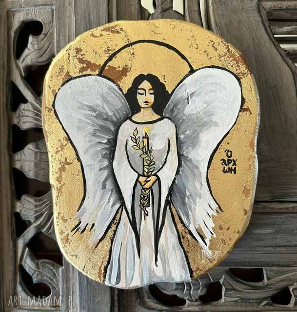 szybka wysyłka"anioł na teakowej desce" ikona malowana i złocona ręcznie o wymiarach. Obraz - desce obrazy Pozłota wykonana jest z metalowych płatków zwanych szlagmetalem, grubość 2cm299,00 zł
