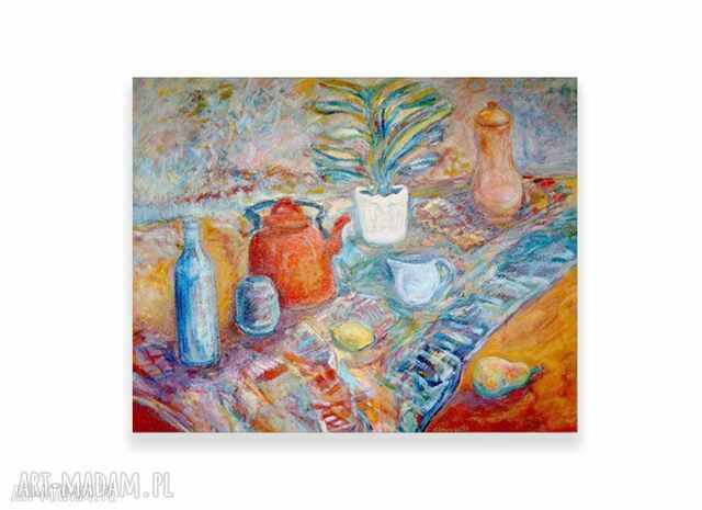 Martwa natura - ręcznie malowany obraz olejny na płótnie lnianym. Len to trwały i wytrzymały materiał. Obraz o bogatej kolorystyce i grubej fakturze farby. Blejtram 100 cm x 81 cm. Obraz jest bez oprawy, wymaga ramy. Praca sygnowana, unikat, oryginał. Malarstwo olejne w ciepłych barwach do salonu, sypialni, jadalni itp.