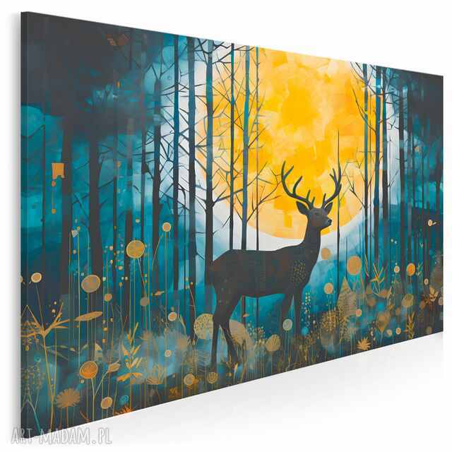 obraz do salonu - jeleń w lesie księżyc nocny krajobraz - 70x50 cm