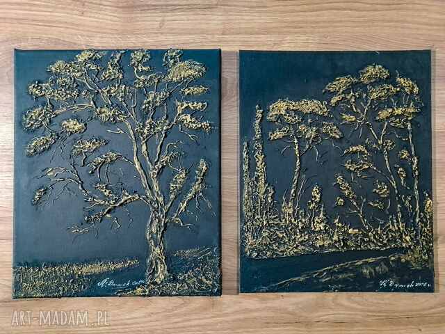 Wyjątkowy dwuczęściowy zestaw - połączenie surowej elegancji i nowoczesnego designu, dzięki czemu idealnie wpisuje się w modny styl Scandi-Glamour, loft lub nowoczesną klasykę. Szyk, natura i blask złota... Ciemna kolorystyka sprawia, że wnętrze nabiera klasy, a biżuteryjny blask przyciąga wzrok każdego widza. To coś więcej niż płótno - to gra cieni i wypukłości, które zapraszają do dotyku. Każde pociągnięcie szpachlą było starannie przemyślane, by stworzyć harmonijną kompozycję. Nie jest to wydruk, lecz autorskie dzieło z wyraźnym śladem ręki artysty. Idealne rozwiązanie dla osób szukających dodatków klasycznych i nowoczesnych jednocześnie. Dekoracja doskonała do salonu, sypialni, luksusowego gabinetu, czy na ekskluzywny prezent.