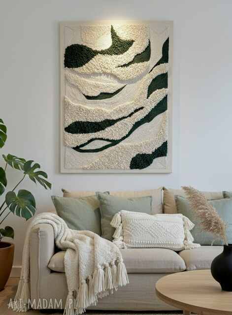 Połączenie ecru z głęboką zielenią tworzy spokojną, organiczną formę, która pięknie współgra z naturalnymi wnętrzami i dodaje im miękkości dzięki wyrazistej strukturze.