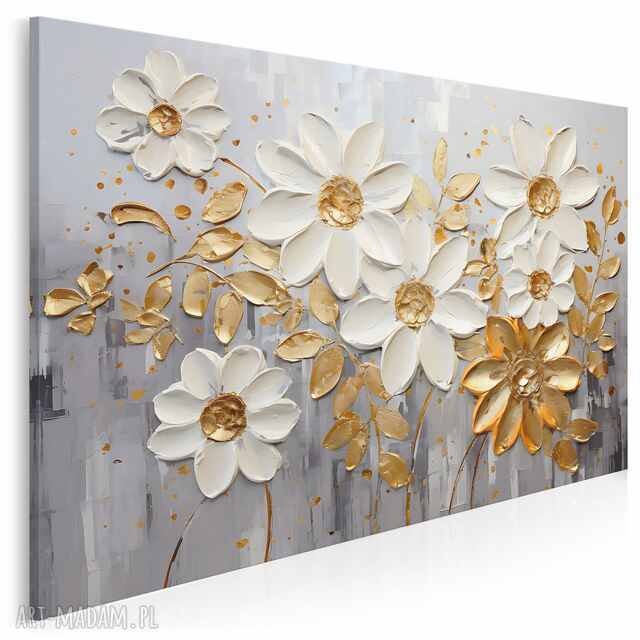 obraz do salonu - białe kwiaty złote liście elegancki motyw - 70x50 cm