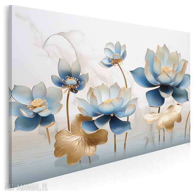 DESIGN: Subtelny i elegancki obraz przedstawiający stylizowane kwiaty lotosu w odcieniach błękitu i złota. Harmonijna kompozycja nadaje wnętrzu lekkości, spokoju i luksusowego charakteru.