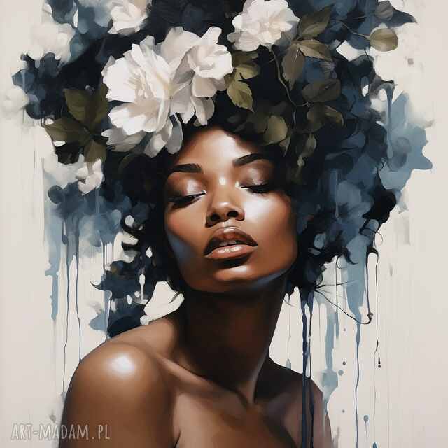 Obraz - wydruk na płótnie przedstawiający czarnoskórą kobietę z kwiatami we włosach. Obraz portret kobiety.