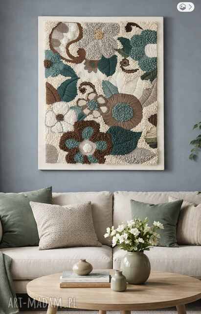 ✨Odkryj niezwykły świat faktur i kolorów dzięki temu ręcznie tkanym obrazowi, który łączy w sobie sztukę i przytulność wnętrza. Obraz wykonany jest z włóczek o różnych grubościach, przy użyciu technik tworzących bogatą, trójwymiarową strukturę - każdy detal można niemal dotknąć, podziwiając głębię i charakter kompozycji.