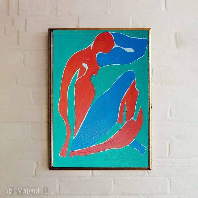 Na obrazie dominują jaskrawe kolory: głęboki czerwony w kontraście z niebieskim i zielonym tłem. Kształty są abstrakcyjne, ale coś tam sugeruje postać człowieka. Kompozycja jest dynamiczna. Linie są płynne, a krawędzie wyraźne. Atmosfera przypomina mi letnie słońce, pełna energii, ale też tajemnicy. Artysta użył techniki impasto, co widać w grubych warstwach farby i teksturze. Styl nawiązuje do ekspresjonizmu, gdzie forma ustępuje emocji. Obraz może wywoływać poczucie ruchu i siły. Może też powodować trochę zastanowienia. Czy to radość, czy może smutek? Patrząc na to, chciałoby się krzyknąć: Wow! Jakie to niesamowite! to wygląda jak wielka plama! Prace takie jak ta pozwalają nam na chwilę oderwać się od codzienności i zanurzyć się w świat koloru. To takie "awesome", jakby powiedzieli Anglicy. Patrząc na to, czuję, jakby energia wprost z obrazu przepływała do mnie.