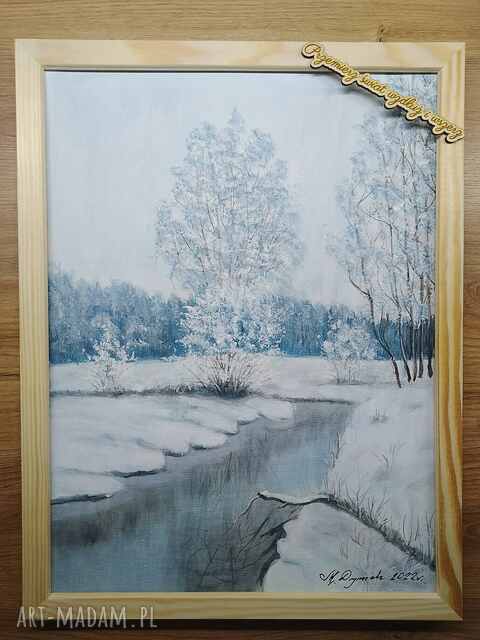 Klasyczny, kojący, zimowy krajobraz. Centralnym punktem kompozycji jest malownicza rzeka, której ciemne wody kontrastują z czystością i nieskazitelną bielą śniegu. Idealna dekoracja dla osób ceniących naturę, ciszę, tradycyjnie urokliwe malarstwo pejzażowe. Pięknie wypełni oraz udekoruje ściany salonu, sypialni, czy gabinetu dodając wnętrzom intrygującej elegancji.