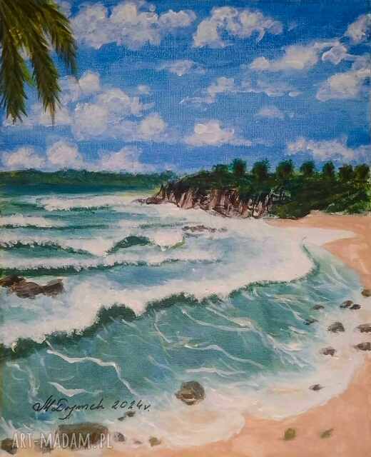 Przenieś się na dziką, skąpaną w słońcu plażę. Dynamicznie spienione fale oraz skaliste wybrzeże w oddali tworzą kojącą, wakacyjną atmosferę. To idealna ucieczka od codzienności, zamknięta w starannych pociągnięciach pędzla. Wyjątkowy, ręcznie malowany obraz. Emanuje spokojem i harmonią wprowadzając do wnętrza powiew natury oraz relaksujący nastrój. Przepięknie udekoruje ściany salonu, sypialni, czy gabinetu. Idealny również jako prezent na każdą okazję.
