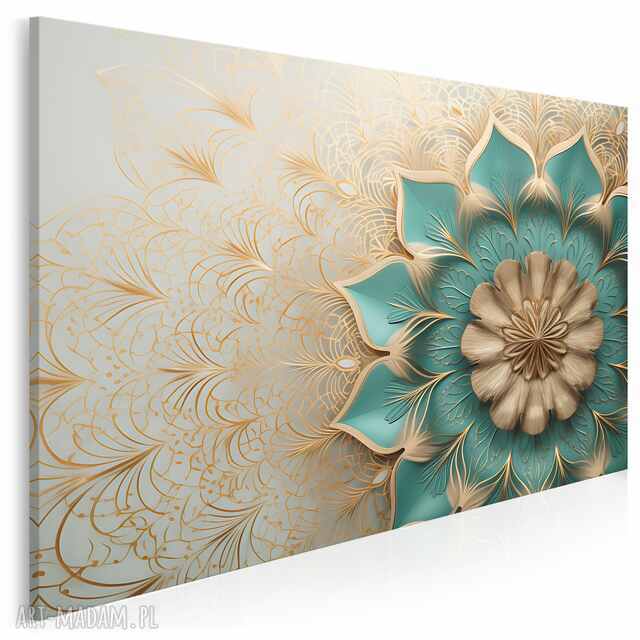 obraz do salonu - turkusowy kwiat złote ornamenty motyw mandali - 70x50 cm (103501)