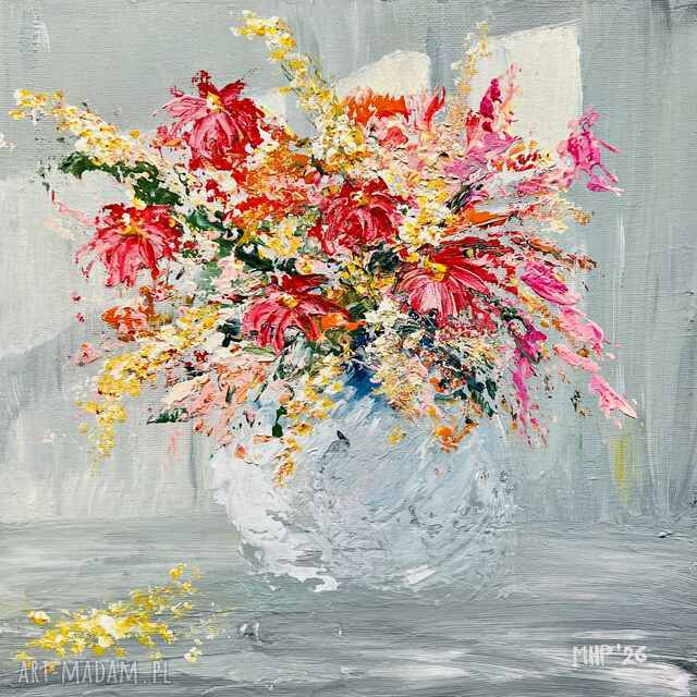 Praca Bukiet II to obraz namalowany farbami akrylowymi na podobraziu 3D o wielkości 30 x 30 cm.