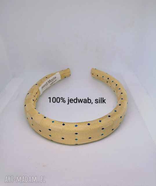Przedstawiona na zdjęciu żółta jedwabna opaska do włosów to unikalny produkt typu handmade, wykonany z jedwabnego krawata. Produkty tego rodzaju powstają w duchu ideologii zero waste, co sprawia, że każda sztuka jest niepowtarzalna. Słomkowo żółty z delikatnym wzorem geometrycznym niebieskie romby. Ręcznie robiona (handmade) na gotowej wyprasce o szerokości ok. 2,5 cm z miękkim wypełnieniem z gąbki dla efektu tiary.