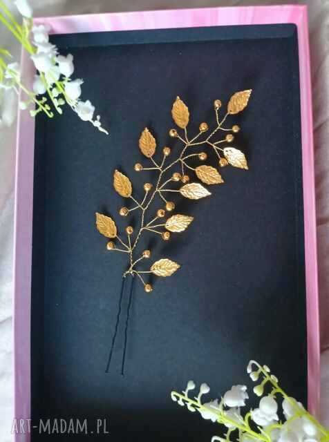 Kokówka, szpilka, wsuwka wykonana na giętkim złotym druciku ze złotych listków i złotych perełek. Pięknie przyozdobi elegancka kreację. Na wieczorowe wyjścia, uroczystości, ślub, wesele.