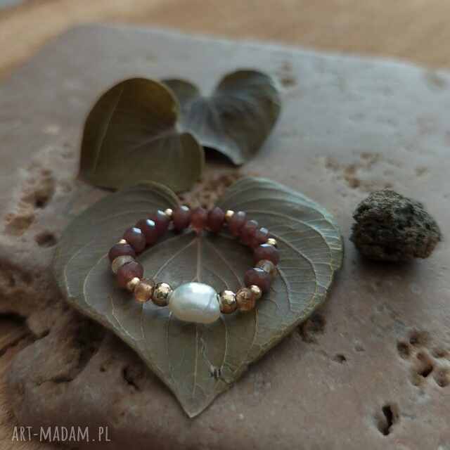 Zjawiskowy pierścionek będący kwintesencją kolekcji Earth. Łączy w sobie kojące barwy ziemi, a także nieregularne kształty, dzięki którym perełka umieszczona w szczycie pierścionka jest absolutnie unikatowa. Oprawę perły stanowią hessonity - minerały o pięknym, miodowo - bursztynowym wybarwieniu, a także brązowe jadeity w formie fasetowanych oponek. Kamienie uzupełnione są ozdobnymi elementami ze stali szlachetnej w kolorze złotym. Połączenie drobnych kamieni i pereł to hit od kilku sezonów - uzupełni elegancką stylizację, ale świetnie podkręci także casualowy look!