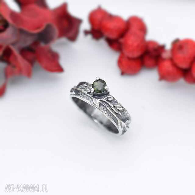 pierścionek z zielonym turmalinem i roślinnym wzorem