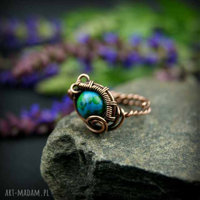 Pierścionek wykonany w pracochłonnej technice wire wrappingu. Centralnym punktem jest tu chryzokola, która została misternie opleciona miedzią. Pierścionek w uniwersalnym rozmiarze, możliwość regulacji.