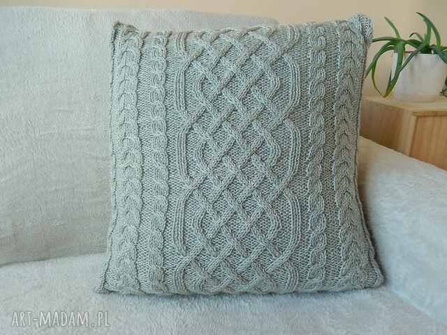 Ta unikalna i wyjątkowo pracochłonna poduszka jest zrobiona na drutach z wysokiej jakości włóczki akrylowej w kolorze jasnoszarym, która się nie mechaci, nie uczula i jest bardzo miła w dotyku. Głównym motywem jest przepiękny wzór warkoczowy. Ma taki sam kolor i podobny wzór jak "Szara warkoczowa poduszka", razem mogą stanowić komplet.