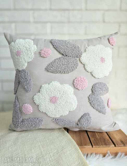Poduszka z aplikacją w kwiaty, wymiary 40x40, materiał to len i bawełna, poszewka zapinana na zamek.
