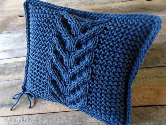 Poduszka wykonana ręcznie, na drutach z grubego w 100% naturalnego, bawełnianego sznurka w odcieniu chabrowym.