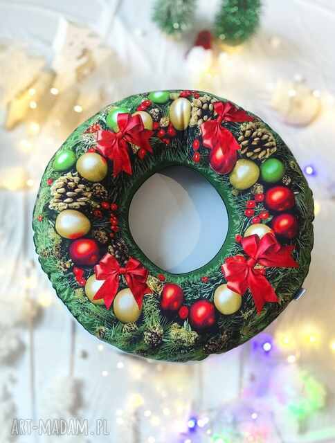 Mamy przyjemność przedstawić Państwu naszą nową ofertę sprzedaży wyjątkowej poduszki w kształcie pączka z dziurką, wypełnionej kulką silikonową. Nadruk przedstawia zimowy wieniec świerkowy udekorowany bombkami i czerwonymi kokardami. Nasza poduszka wykonana jest z wysokiej jakości microfibry, która jest nie tylko miękka i przyjemna w dotyku, ale także bardzo trwała. Front poduszki to połączenie koloru ciemnozielonego, zielonego i czerwonego a tył to ciemnozielony welur. Poduszka "Wieniec choinka i bombki" z pewnością zachwyci każdego swoim wyglądem.
