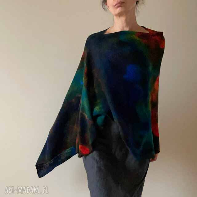 Unikatowe, ręcznie barwione ponczo z najwyższej jakości wełny z merynosów. Uniwersalne, na każdy sezon, na każdą sylwetkę i rozmiar. Do noszenia na co dzień i na wieczorowe wyjście. Doskonałe jako wierzchnie okrycie na wiosenne, letnie, czy jesienne chłody, a w zimie w charakterze swetra. Idealny na prezent dla Niej.