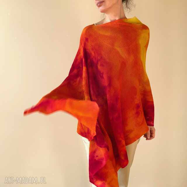 Unikatowe, ręcznie barwione ponczo z najwyższej jakości wełny z merynosów. Uniwersalne, na każdy sezon, na każdą sylwetkę i rozmiar. Do noszenia na co dzień i na wieczorowe wyjście. Doskonałe jako wierzchnie okrycie na wiosenne, letnie, czy jesienne chłody, a w zimie w charakterze swetra. Idealny na prezent dla Niej.