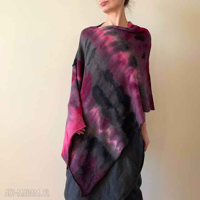 Unikatowe, ręcznie barwione ponczo z najwyższej jakości wełny z młodej alpaki, przemiłe w dotyku. Uniwersalne, na każdy sezon, na każdą sylwetkę i rozmiar. Do noszenia na co dzień i na wieczorowe wyjście. Doskonałe jako wierzchnie okrycie na wiosenne, letnie, czy jesienne chłody, a w zimie w charakterze swetra. Idealny na prezent dla Niej.