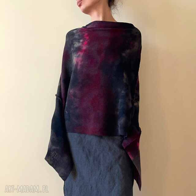 Unikatowe, ręcznie barwione ponczo z najwyższej jakości wełny z merynosów. Uniwersalne, na każdy sezon, na każdą sylwetkę i rozmiar. Do noszenia na co dzień i na wieczorowe wyjście. Doskonałe jako wierzchnie okrycie na wiosenne, letnie, czy jesienne chłody, a w zimie w charakterze swetra. Idealny na prezent dla Niej.